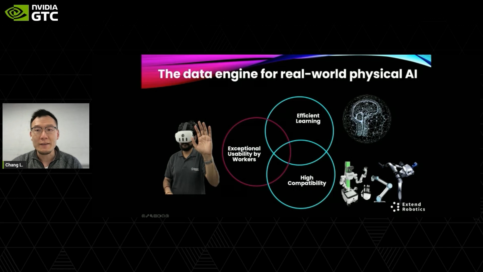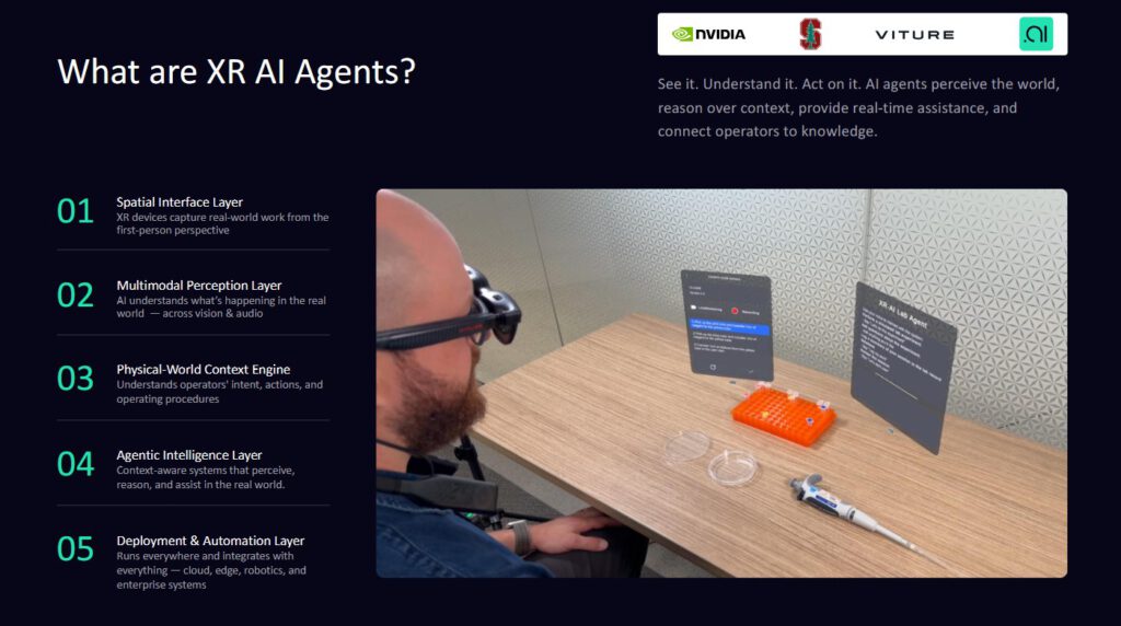 In XR/VR and design workflows, the same strategic logic shows up through Omniverse and CloudXR: 3D content tools feed into shared, physically based virtual worlds where robots, vehicles, and interfaces can be simulated and iterated; XR devices become front-ends to these simulations. GTC 2026 demos highlighted this with industrial and entertainment robots animated for XR teleoperation, medical research workflows streamed to Viture XR glasses and Apple Vision Pro via CloudXR, and robot training sessions with Meta Quest and Pico headsets for real-time physics testing and VR-based control.